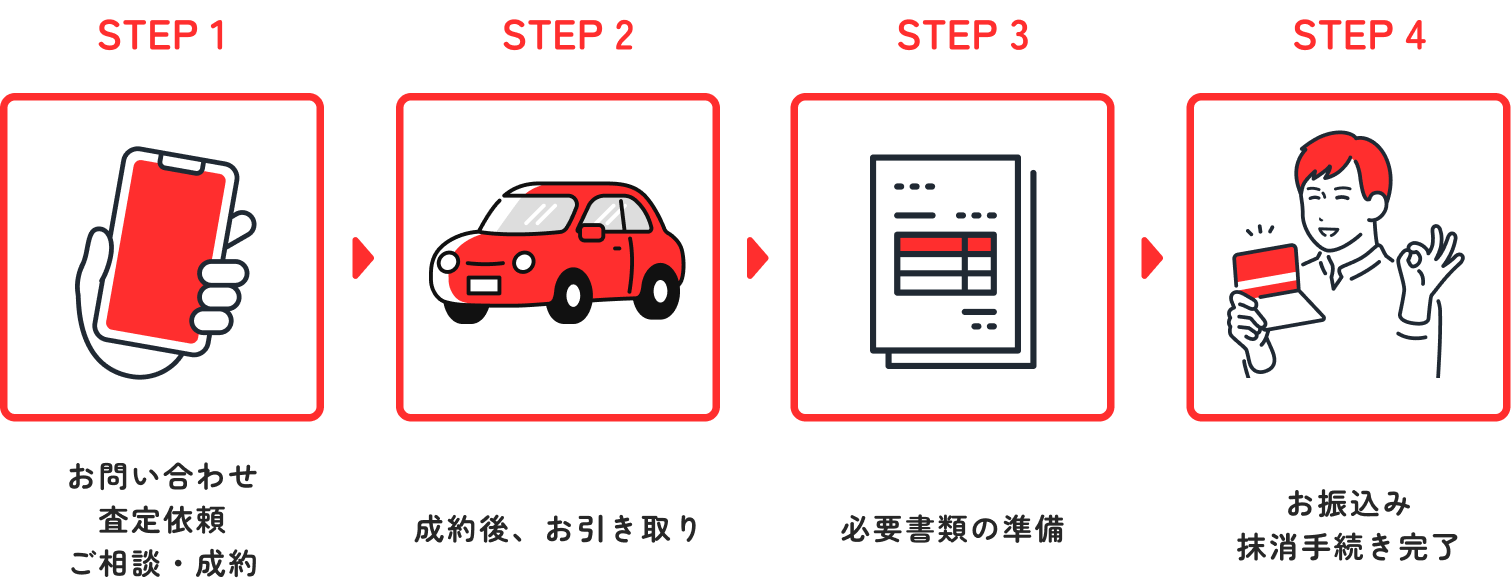 1. 問い合わせ・買取価格提示 2.契約・引取り 3.廃車必要書類準備 4.お振込5.後日抹消コピー送付(通常1か月以内)