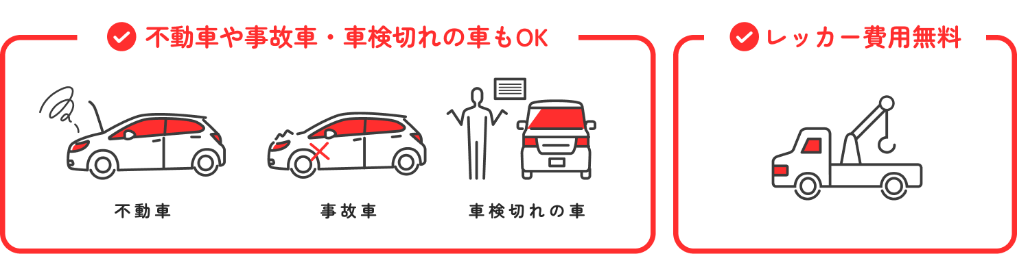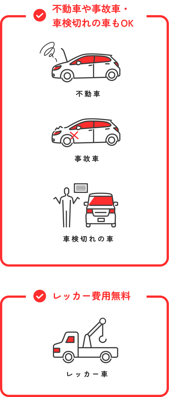 ①車種によって、高額買取いたします。②店頭へのお持ち込みの場合は、買取価格に3,000円をプラスいたします。③書類がすべて揃っている場合は、その場で現金にてお支払いします。④関東近県であれば、どこでも無料で引き取りに伺います。⑤エンジンのない車両は買取対象外となります。⑥トヨタ車はプラス査定となります。